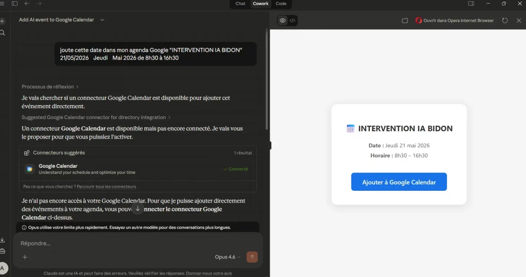 J’ai demandé ensuite à Claude COWORK l’agent local de reprendre le planning et de m’ajouter les dates dans mon agenda Google.