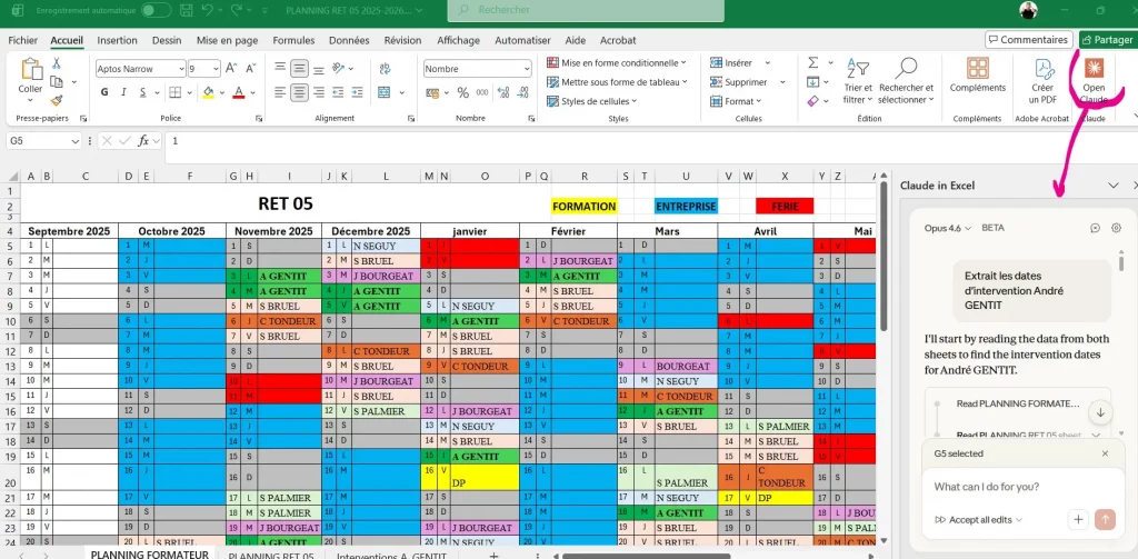 - Claude dans Excel extrait les dates d’intervention et les met dans un tableau propre