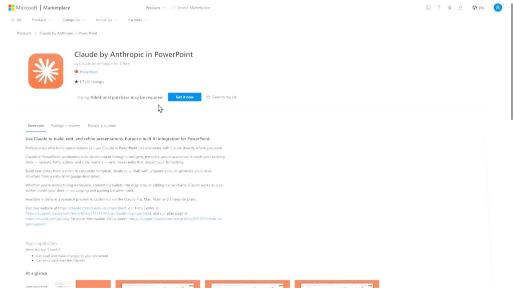 Ouvrez PowerPoint, allez dans l’onglet Insertion, puis cliquez sur Obtenir des compléments. Vous pouvez aussi passer directement par le Microsoft Marketplace en ligne. Dans la barre de recherche, tapez « Claude by Anthropic » et cliquez sur Télécharger maintenant.
