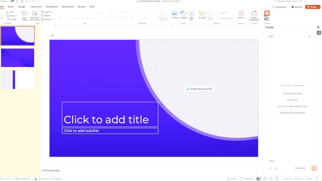 Un détail qui a son importance : ce panneau n’est pas un gadget cosmétique collé sur l’interface. Claude accède réellement aux éléments natifs de PowerPoint — mises en page, zones de texte, hiérarchie des masques. C’est ce qui fait la différence avec un simple chatbot qui génèrerait du contenu à copier-coller.