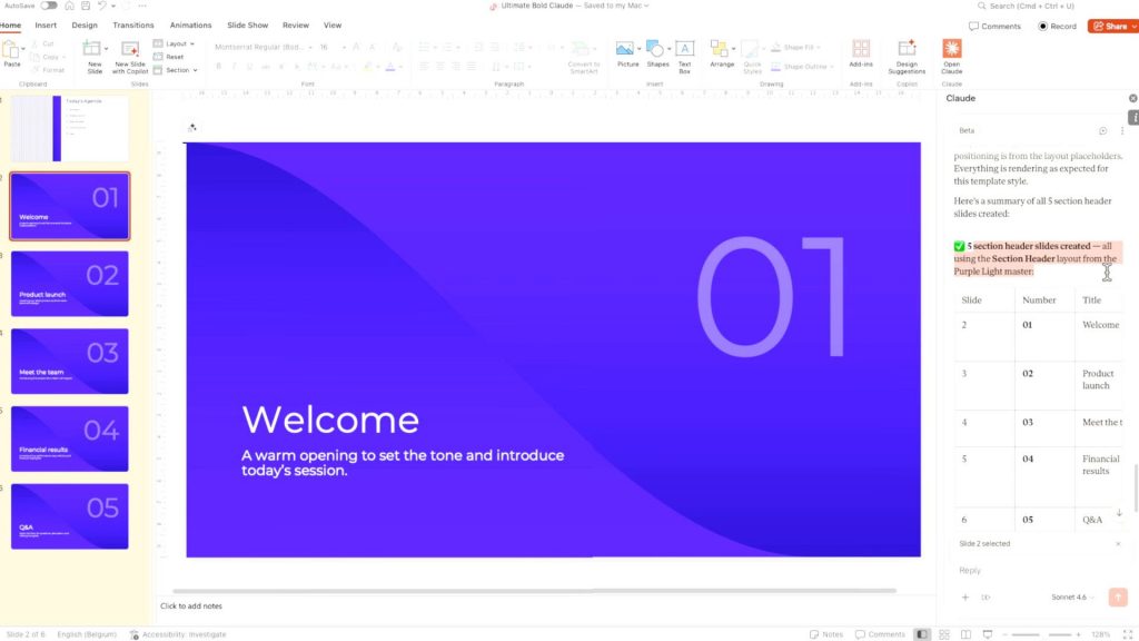 Claude duplique la mise en page d’en-tête de section, applique la numérotation séquentielle, génère des sous-titres cohérents avec chaque thème, et insère le tout dans l’ordre. Cinq diapositives créées en une seule instruction, toutes conformes à votre charte.