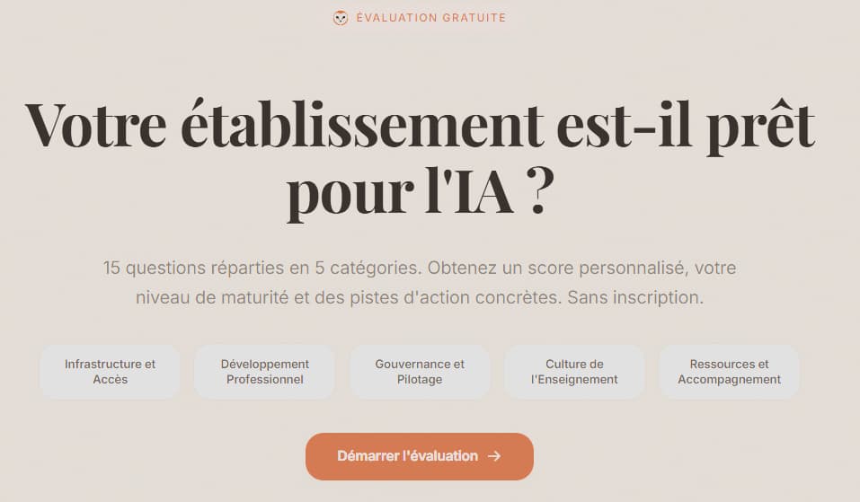 Flip Education — AI Readiness Assessment : diagnostic gratuit pour évaluer la maturité IA d’une structure éducative ou de formation. 5 axes, résultats instantanés, recommandations personnalisées. Un outil proposé par Raian Pollock de Flip Education qui s’avère être un bon outil d’analyse pour faire le point sur votre stratégie d’adoption des outils d’intelligence artificielle. Vous êtes nombreux à les exploiter sans avoir pris le temps de se former sur l’étendue d’adaptations que permettent ces outils.