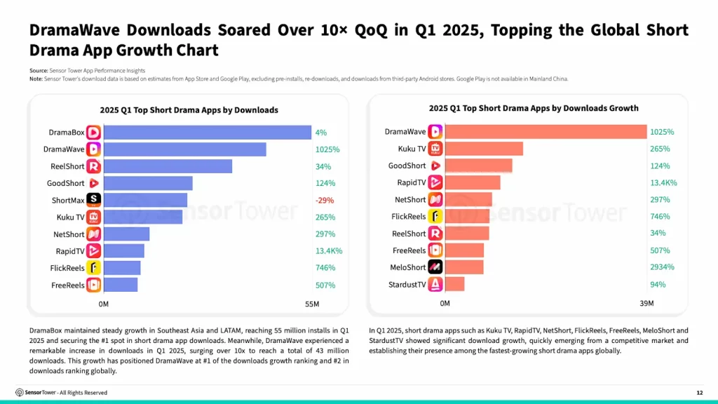 • Les revenus in-app des applications de short drama sont passés d’environ 178 M$ au T1 2024 à près de 700 M$ au T1 2025, soit une multiplication par presque 4 en un an.