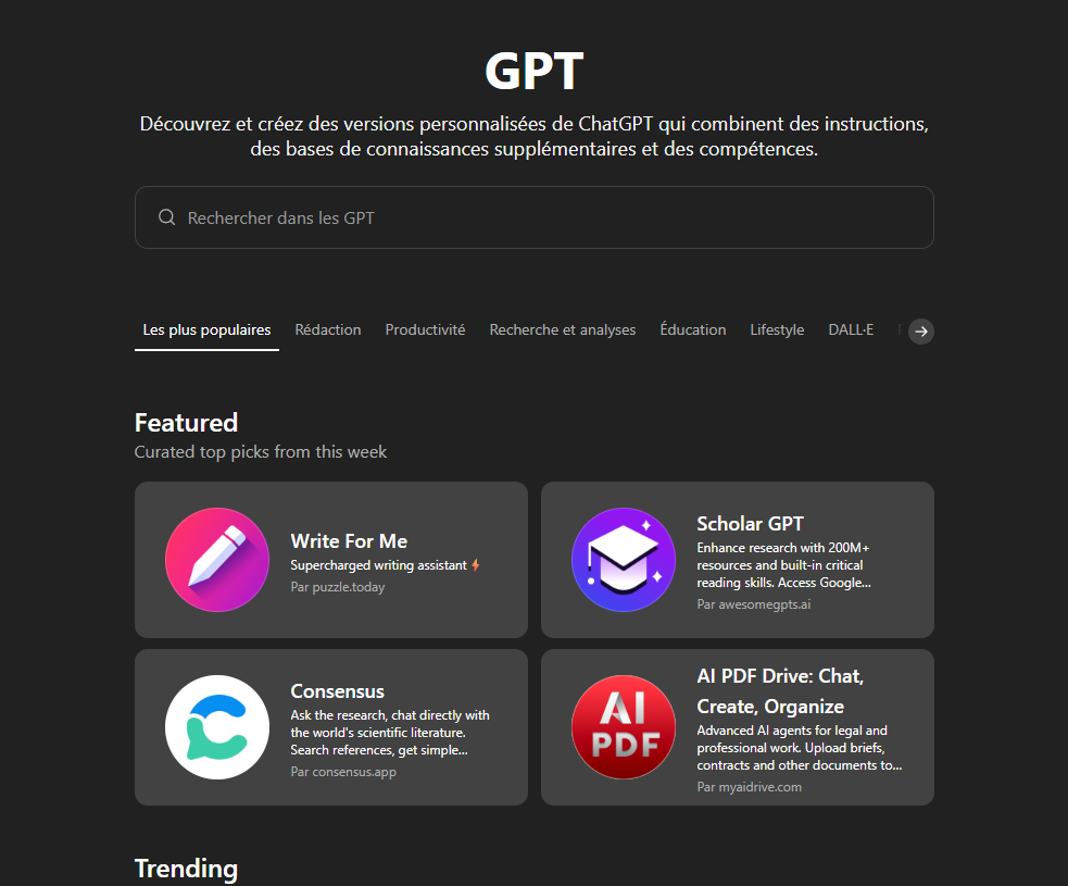 Exemple concret : Vous trouvez un GPT spécialisé dans la gestion associative qui génère convocations, ordres du jour et comptes rendus automatiquement. Le moteur de recherche est très utile car il vous donne les GPT’s disponibles ainsi que le nombre d’utilisations.