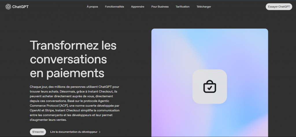 Chaque jour, des millions de personnes utilisent ChatGPT pour trouver leurs achats. Désormais, grâce à Instant Checkout, ils peuvent acheter directement auprès de vous, directement depuis ces conversations. Basé sur le protocole Agentic Commerce Protocol (ACP), une norme ouverte développée par OpenAI et Stripe, Instant Checkout simplifie la communication entre les commerçants et les développeurs et leur permet d’augmenter leurs ventes.
